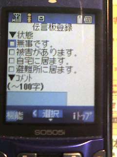 2005年10月17日 携帯の災害伝言板サービス 昨日の関東の地震、戸田市は震度4だったが、書斎に入るといくつか本が落ちていた。 昨日も書いたが、改めて自分でできる地震対策を確認することにした。 ところで、携帯電話で災害伝言ができるのをご存じだろうか。 予め登録したメールの宛先全てに、画面から一括送信できる仕組みもついていたと思う。 毎月1日は、練習できるようになっているので、お試しあれ。(詳しくはまた調べてアップします)。 「携帯で撮影」カテゴリの最新記事 < 前の記事次の記事 > コメント コメント一覧 おけい 2005年10月18日 11:56 先生いつもありがとうございます。 タイトルと全然関係ないのですが質問です。 フォトショップエレメンツを注文したいのですが 「Adobe Photoshop Elements 3.0 日本語版 Windows版 乗換え・アップグレード専用パッケージ 」を購入すれば4.0に無償にアップできるのでしょうか? ご都合が良いときに教えて頂ければ助かります。 ふゆさん(管理人) 2005年10月20日 20:58 おけいさん コメントありがとうございます! 今なら、3.0を買うと、4.0に無償アップグレードできますよ。 おけい 2005年10月20日 22:44 先生お返事ありがとうございます。 早速購入しま〜す。 明日から地元の講演がんばってください!! 疲れたらゲルマのお風呂で・・・これすごくいいですよね。先生のお陰ではまってますが、品切れ状態で困ってます。 コメントフォーム 名前 コメント 評価する リセット リセット 顔 星 投稿する 情報を記憶 トラックバック