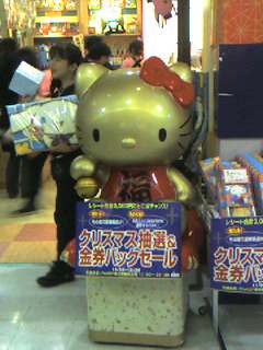 池袋サンシャインシティ地下にあるサンリオショップ入口にある「招きネコ」ならぬ「招キティ」ちゃん。しかも金色!このお店はキティちゃんだらけ。日本各地の「ご当地キティ」グッズも売られていた。