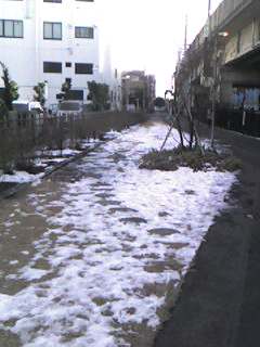 戸田公園駅から埼京線に沿って戸田に向かって少し行った所にある万葉の花のみちで撮影。先週戸田市に降った雪の名残、日があたらないためすっかり氷になっている。