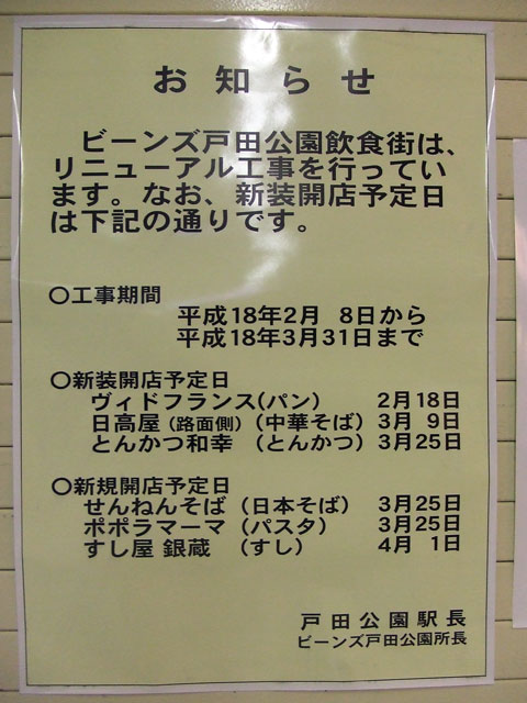 JR戸田公園駅構内で続けられている飲食店舗オープンデッキ化工事の日程が、駅に張り出されている。工事期間 3月31日まで