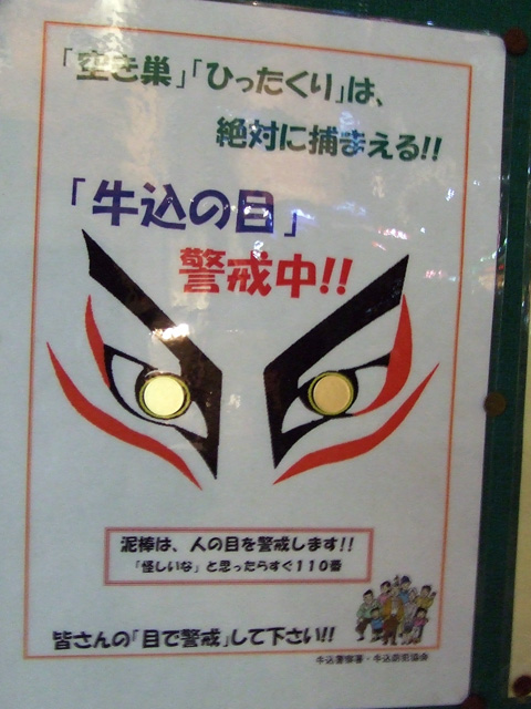 2006年03月22日 (東京)夜中に光る牛込の目 東京都飯田橋近くの掲示板に貼っていた防犯ポスター。「牛込の目警戒中」とある。よく見たら、目の部分が金色になっていて、ちょっとの光でもきらきら反射するようになっている。ちょっと怖い。面白い発想だけど、これで防犯効果があがるかどうかは不明である。いろんな地域でその地域独特の防犯ポスターをみるが、意外に地域性が出ていて楽しいものである。 「キャラクター」カテゴリの最新記事 < 前の記事次の記事 > コメント コメントフォーム 名前 コメント 評価する リセット リセット 顔 星 投稿する 情報を記憶 トラックバック