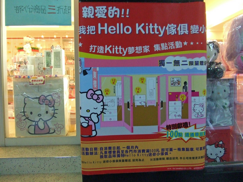 2006年06月22日 (台湾)台湾でみっけ! 小ネタ編その1 台北市のサンリオショップに貼られてたポスター。キティの家具が100点展示販売されているそうだ。キティに囲まれた生活。キティ好きなら日本も好き!キティは日本の平和外交に貢献しているのかもしれない。 「お仕事紀行」カテゴリの最新記事 < 前の記事次の記事 > コメント コメントフォーム 名前 コメント 評価する リセット リセット 顔 星 投稿する 情報を記憶 トラックバック