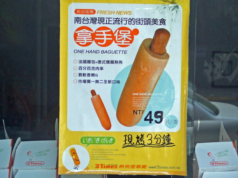 2006年06月23日 (台湾)台湾でみっけ! 小ネタ編その3 台湾の映画館前で売っていたホットドッグもどき。「台湾南部で今大流行している美味しい食べ物」だそうだ。早朝ホテル近くを散歩していて見つけたポスター。お店はまだ開いていなかったので、どんな食べ物か確かめることはできなかった。1本約180円で、3分待ったら熱々を食べることができると書いてあった。 「お仕事紀行」カテゴリの最新記事 < 前の記事次の記事 > コメント コメントフォーム 名前 コメント 評価する リセット リセット 顔 星 投稿する 情報を記憶 トラックバック