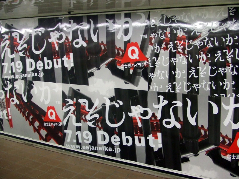 先日、東京に出た際に、新宿駅地下通路で見かけた広告。「ええじゃないか(2番目の“え”は上下逆さまです)」と書かれたその広告、絶叫マシンと独特なCMで有名な富士急ハイランドの新絶叫マシンのPRであった。すでにこの絶叫マシン「ええじゃないか」の公式サイトもできているが、7月19日にオープンするギネス認定の総回転数世界一のローラーコースターだそうだ。ホームページではテレビCMや乗車動画を見ることもできるが、あいかわらずはじけていて素晴らしい!