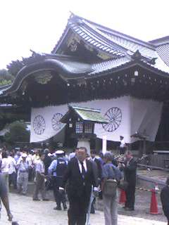靖國神社の問題については様々な意見があります。特に昨今は中華人民共和国や大韓民国が外交問題に関連させるようになっていますので、なおさら内外の注目が集まっています。しかも、今朝、小泉首相が現役総理大臣として参拝されたばかりでしたので報道陣も多く来ておりました。