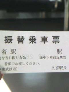 2006年08月31日 東武伊勢崎線架線断線 埼京線沿線には関係ありませんが、本日午後1時半頃に東武伊勢崎線東武動物公園駅で架線事故があり、ただいま伊勢崎線は全面ストップしています。 復旧の見込みはまだわからないとのこと。 初めて「振替乗車票」をもらいました。 「携帯で撮影」カテゴリの最新記事 < 前の記事次の記事 > コメント コメント一覧 terachan 2006年08月31日 16:03 お疲れ様です。 昔よくありました。 JR総武線の 普通で京成線で振り替え輸送にあい、それからとぼとぼ歩いて帰寮しました。 やはり夏の終わりでした。 terachan 2006年08月31日 16:07 35年前総武線の不通のため京成線にて振り替え輸送となり、駅からとぼとぼ帰寮したことを思い出しました。 こういうピンチはつらいが後からは懐かしい思い出です。がんばって下さい。 ふゆさん(管理人) 2006年09月04日 22:38 terachanさん 先日はありがとうございました。 確かに、良い思い出になりました。 両毛線もなかなかです。 また、両毛線の足利駅からの市内ルートで、足利市商店街の街なみの美しさがわかりました。 今後ともよろしくお願いいたします。 コメントフォーム 名前 コメント 評価する リセット リセット 顔 星 投稿する 情報を記憶 トラックバック