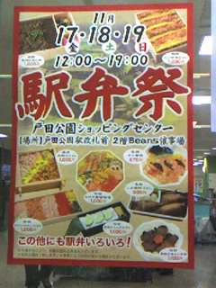 2006年11月16日 戸田公園Beensで駅弁祭り 明日11月17日(金)から19日(日)にかけて、戸田公園駅にあるショッピングセンターBeens戸田公園の催事コーナーで「駅弁祭」が開催されると案内が貼られていました。 いつもは下のサミットで地方の有名駅弁の販売がたまに企画されていますが、その時に販売される駅弁とは違うものが販売されるようですね。 駅弁…列車の旅… あぁ、旅に出たいよぅ。 「携帯で撮影」カテゴリの最新記事 < 前の記事次の記事 > コメント コメント一覧 さくたい 2006年11月16日 11:38 そんなイベントをやっているとは近くの物ほど見えない物ですね〜。ちょっと拝見してきま〜す。 ショコラ 2006年11月16日 13:45 駅弁・・美味しいのもありますがいつも半額ねらっています。 金沢、富山に縁のある私は「ますのすし」だけは駅弁では買わないんですけどね・・駅弁フェアといえば必ずあるし・ この値段だしても!というお勧め駅弁ないですかねぇ。 でも、近いので見に行っちゃおうかな。 コメントフォーム 名前 コメント 評価する リセット リセット 顔 星 投稿する 情報を記憶 トラックバック