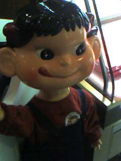 自粛されているのか、大きなペコちゃん人形は入口ドアの内側に置かれ、その後ろにはお土産用に販売されているペコちゃん人形がずらりと並んでおりました。