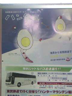 2007年12月30日 ハンタマ! 少し前のニュースで彦根城のキャラクター「ひこニャン」騒動がひと段落したという話を聞きましたが、あちらこちらで地域キャラクターが活躍していますよね。 写真は先ほど電車乗り換えの際に目にしたポスターです。 半身の卵がなぜスノボを? 近寄ってポスターをよく読むと、スキー場「ハンターマウンテン」のキャラでした。ハンターマウンテン、略してハンタマ、だから半卵…。 印象には残ります。 「携帯で撮影」カテゴリの最新記事 < 前の記事次の記事 > コメント コメント一覧 ちょこ 2007年12月31日 09:50 成る程!(笑) ふゆさん(管理人) 2007年12月31日 22:57 ちょこさん こんにちは! 何か面白いキャラクターを見つけたら教えてくださいね。ハンドル名、短くされたのですか?今回だけ? コメントフォーム 名前 コメント 評価する リセット リセット 顔 星 投稿する 情報を記憶 トラックバック