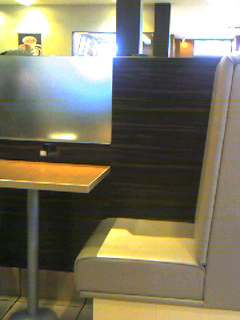 何よりも店内にコンセントがあり(写真のテーブル上中程のしきりにみえる白いのがそうです)、パソコン仕事ができるのがありがたいところです。 座席の背が高く周りにあまり見られないボックス席もあり、ヤフープレミアム会員ならば無線LANでインターネット接続もできるので、たまに私は打ち合わせの時に使います。