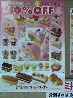 戸田公園駅にコージコーナー10%割引セール開催中のポスターが貼ってありました。このコージコーナーですが、私が学生時代を過ごした関西にはないお店なんですよね。