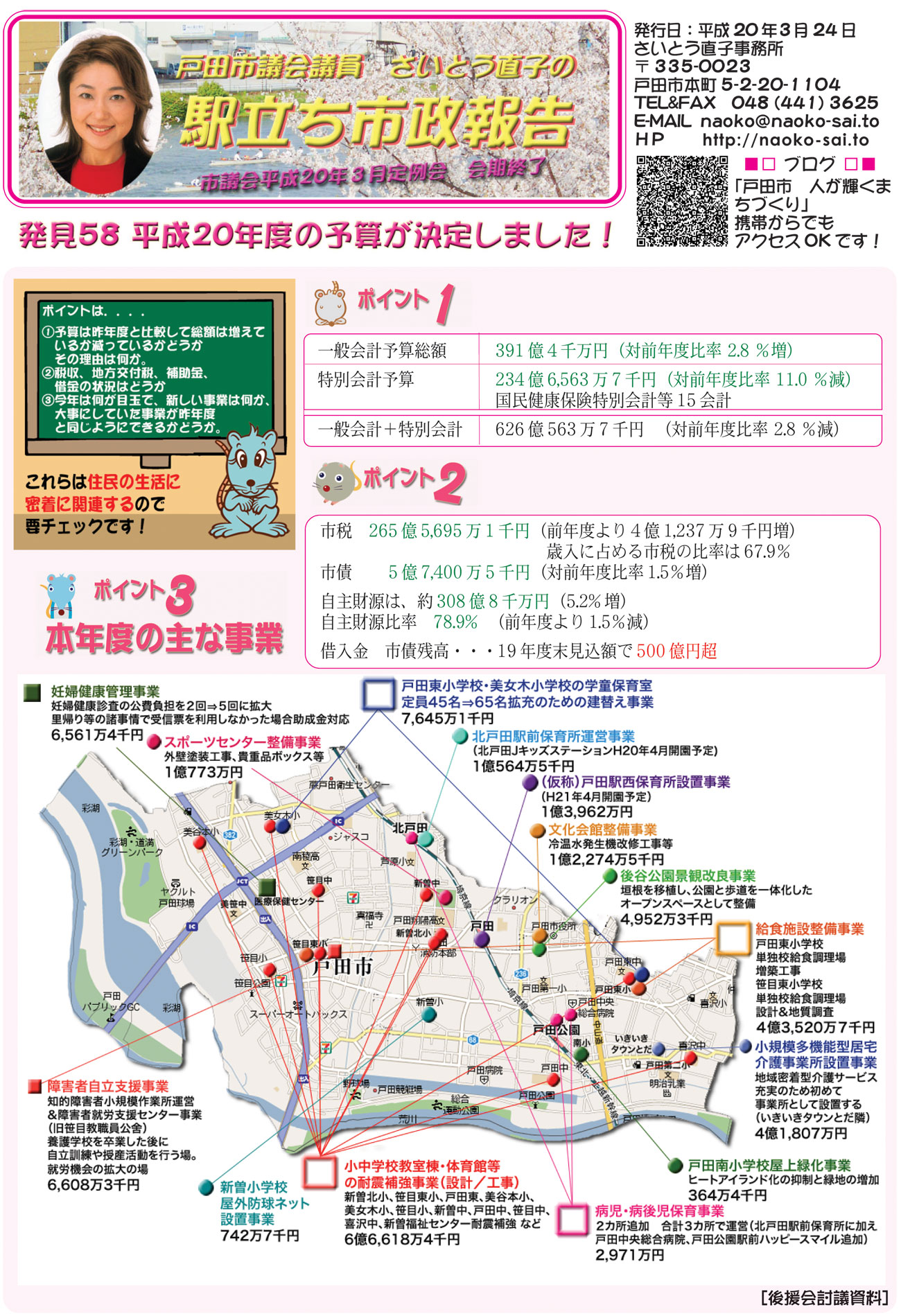 次に、市の予算の使い方を決めるということですが、これについては、さいとう直子さんのサイトに下記のような、平成19年度や平成20年度に市の予算をどう使うよう決めたか(主な施策)が図で表現されているのでそれをご覧ください。