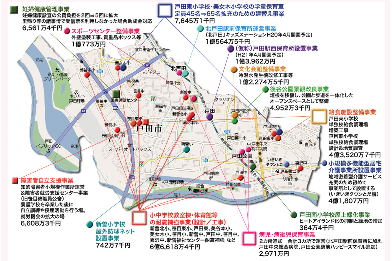 この図では、平成20年度の主な事業が示されていますが、戸田市に住む私たちにとって身近なこんなことなどが、議会で決められ予算がつけられているのです。