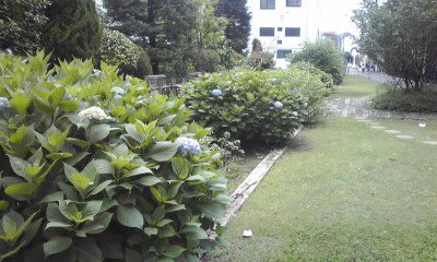 6月、梅雨の時季の花・紫陽花(あじさい)がちらほら咲き始めています。あと一週間くらいするとここは紫陽花の道になるのです。冬には次の時季に花を咲かせるために大幅に剪定されたおかげで、今年も生き生きとした紫陽花が楽しめそうです。