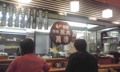 噂の萬清さんは駅前の路地を入ったところにあります。駅からは徒歩で3分もかかりませんでした。萬清さんにたどり着く前には、「亀戸餃子」や「青木ホルモン」など、人気の店が路地に並んでいて、午後1時半過ぎでしたが、店の外に列ができておりました。