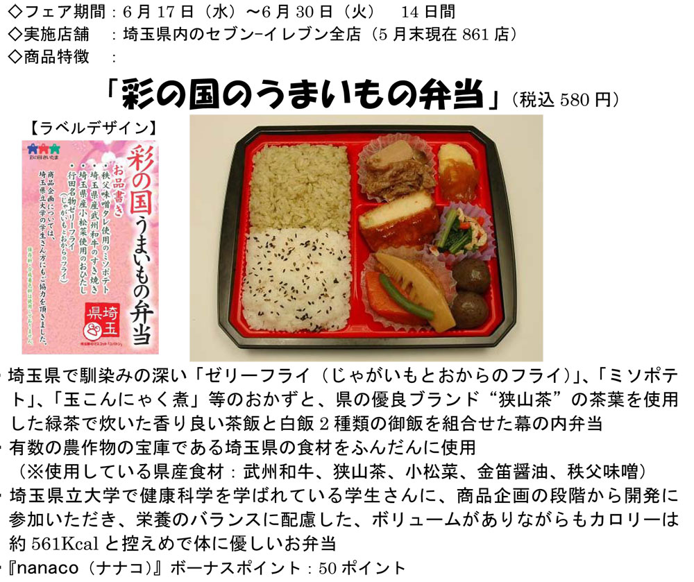 武州和牛や小松菜、しょうゆなど埼玉県産の食材を使い、ゼリーフライ(行田市)、みそポテト(秩父市等)といったおかずが入っています。