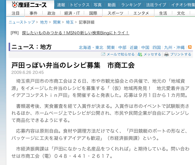 6月27日の産経新聞に、“「戸田っぽい」弁当レシピ募集”という記事が掲載されていました(msn産経ニュースサイトにも掲載)。