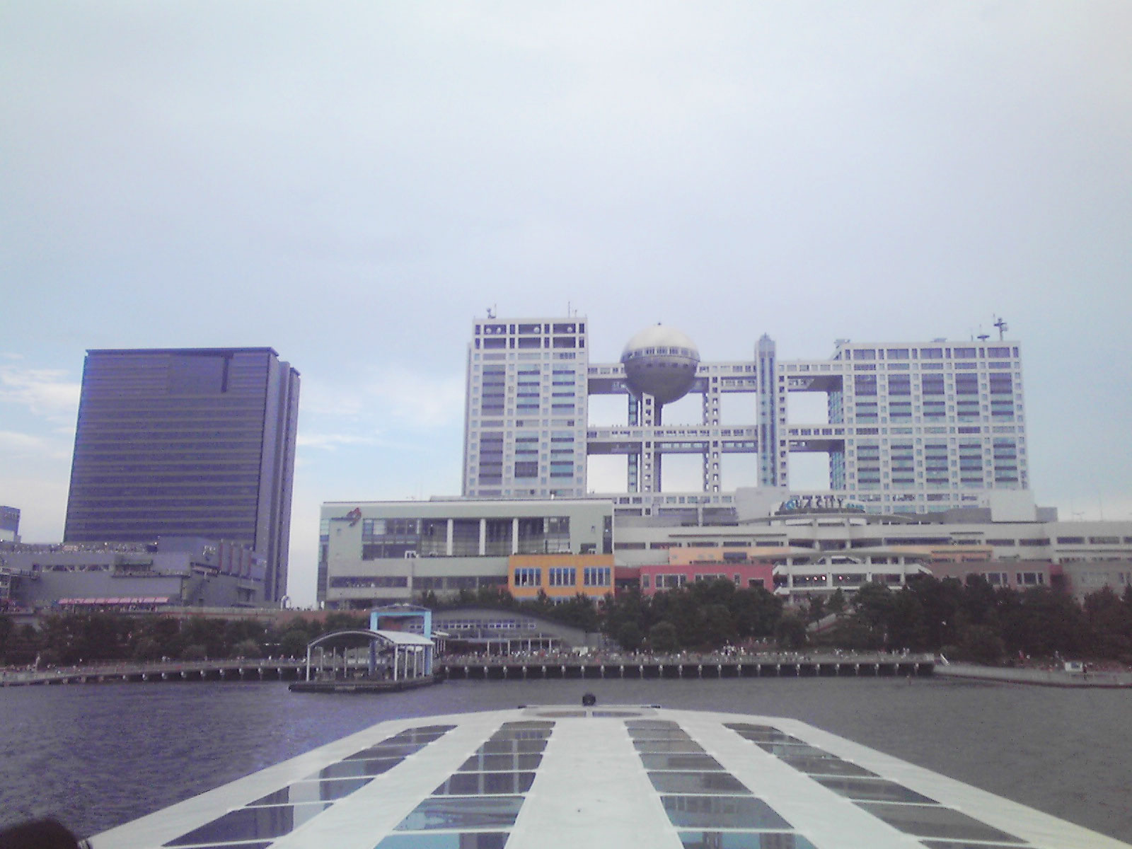 水上バスからみた台場公園停留港。正面にフジテレビビルが見えます。