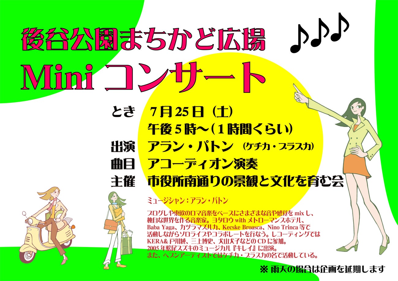 まずは、午後5時から後谷公園東南角地のまち角広場でミニコンサートが開催されます。