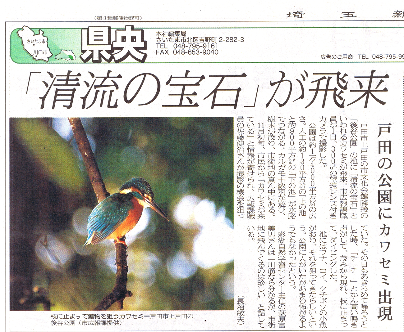 2009年12月04日 戸田市後谷公園にカワセミ出現! 一昨日の毎日新聞、そして本日の埼玉新聞朝刊に記事掲載されていますが、戸田駅より徒歩8分の戸田市役所・戸田市文化会館横にある後谷公園の池に、なんとカワセミが飛来しているそうです。カワセミは「清流の宝石」とも呼ばれる鳥で、カワセミ特有の「チーチー」という甲高い声で鳴き小魚を捕まえるためにダイビングするのが特徴です。市民から情報が寄せられ、市職員の方が見事写真撮影に成功したとのこと。戸田ヶ原の再生事業など、「東京の隣にある水と緑のオアシス都市」を目指す戸田市にふさわしいニュースでした。 タグ :#戸田市#後谷公園#カワセミ 「お知らせ」カテゴリの最新記事 < 前の記事次の記事 > コメント コメントフォーム 名前 コメント 評価する リセット リセット 顔 星 投稿する 情報を記憶 トラックバック