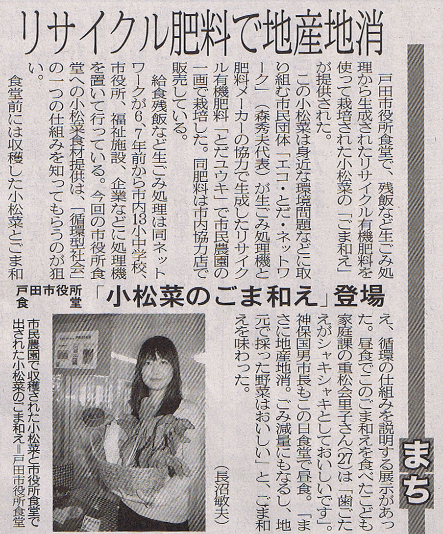 戸田市役所食堂で、給食の残飯などの生ゴミ処理から生成されたリサイクル有機肥料を使って、戸田市内で栽培された小松菜の「ごま和え」が提供されたという記事です。