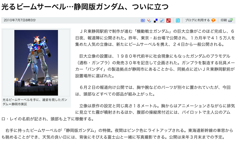 ・・・そうですか、今度のガンダムは光るビームサーベルを持っているのですね。しかも、JR東海道新幹線の車窓から見えるとか! 仕事で大阪にいく機会があるので、ぜひその時にでも拝みたいと思います。帰りはきっと夜になりますし、光るビームサーベルも見えるかも。いやいや、やはりその前に東静岡までいくべきでしょうね。