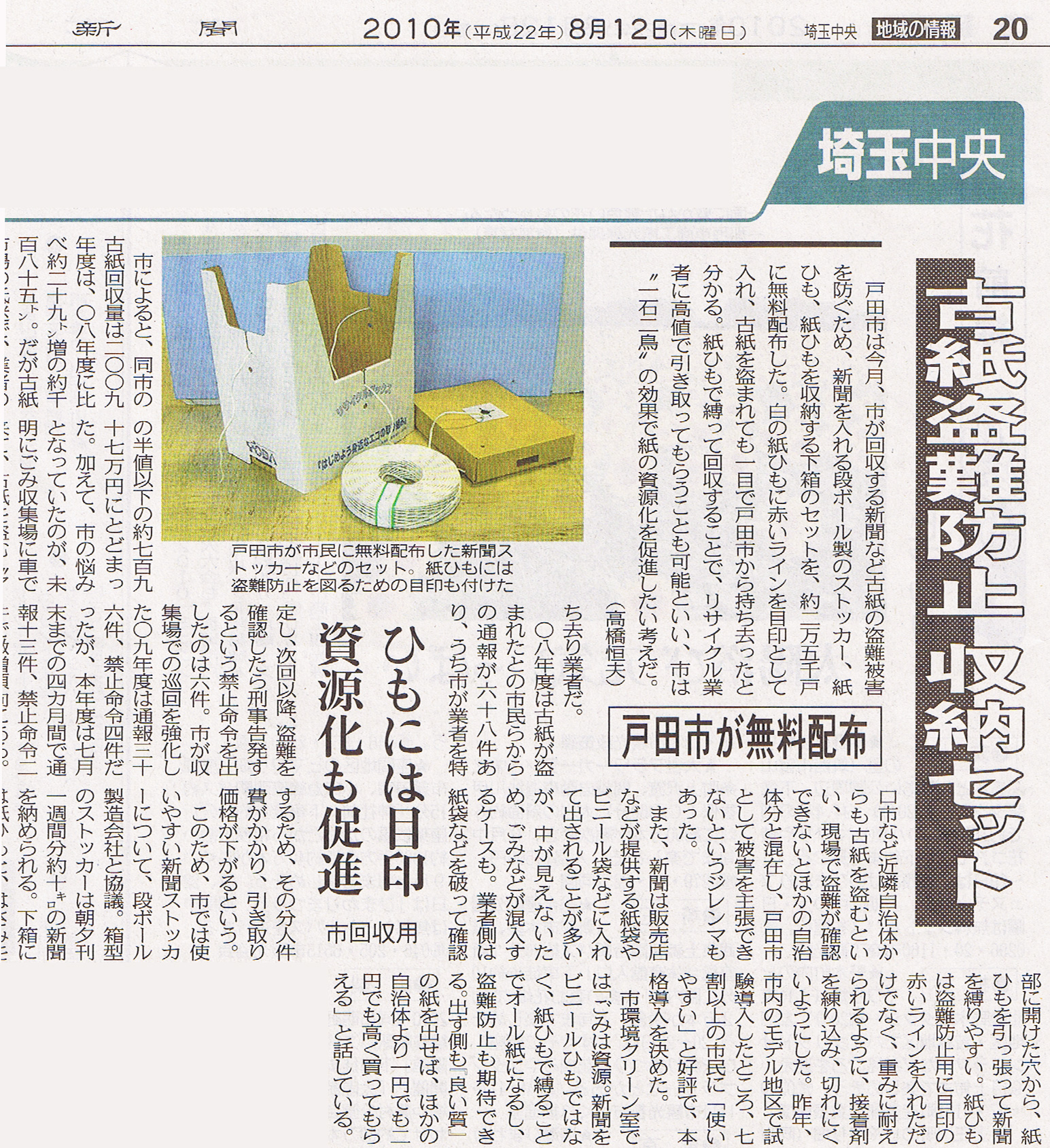 戸田市は今月、市が回収する新聞など古紙の盗難被害を防ぐため、新聞を入れる段ボール製のストッカー、紙ひも、紙ひもを収納する下箱のセットを、約2万5千戸に無料配布した。白の紙ひもに赤いラインを目印として入れ、古紙を盗まれても一目で戸田市から持ち去ったと分かる。紙ひもで縛って回収することで、リサイクル業者に高値で引きとってもうらことも可能といい、市は“一石二鳥”の効果で紙の資源化を促進したい考えだ。