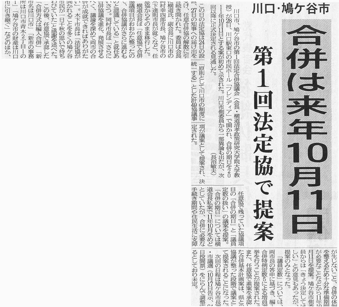 本日の埼玉新聞のトップに「川口市・鳩ヶ谷市 合併は来年10月11日 第1回法定協で提案」という記事が、また、昨日は中ほどに「合併へ県に支援要請 川口、鳩ヶ谷両市長 上田知事を訪問」という記事が掲載されていました。