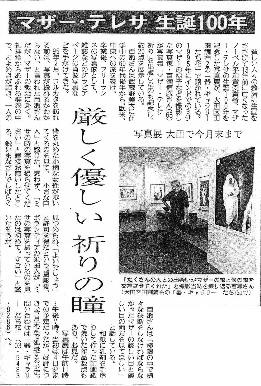 今年の9月には、東京・田園調布のギャラリー「器・ギャラリーたち花」で開催され人気を博した写真展です。下記はその際に掲載された新聞記事です。