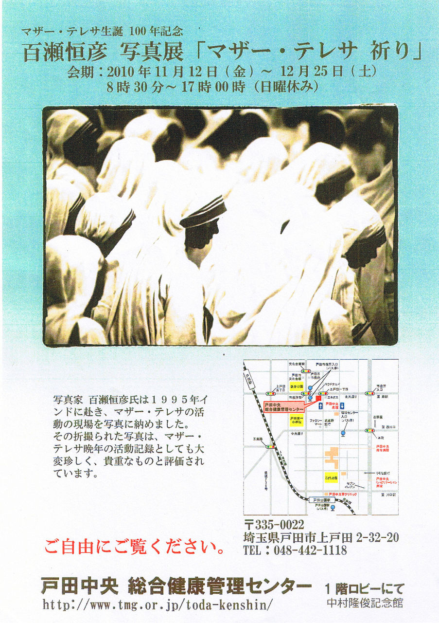 戸田市役所南側の市役所南通りに面する「戸田中央総合健康管理センター(中村隆俊記念館)1階ロビー」(以前、戸田中央産院が建てられていた場所)にて、マザー・テレサ生誕100年を記念して「百瀬恒彦写真展『マザー・テレサ 祈り』」が開催されています(入場無料)。