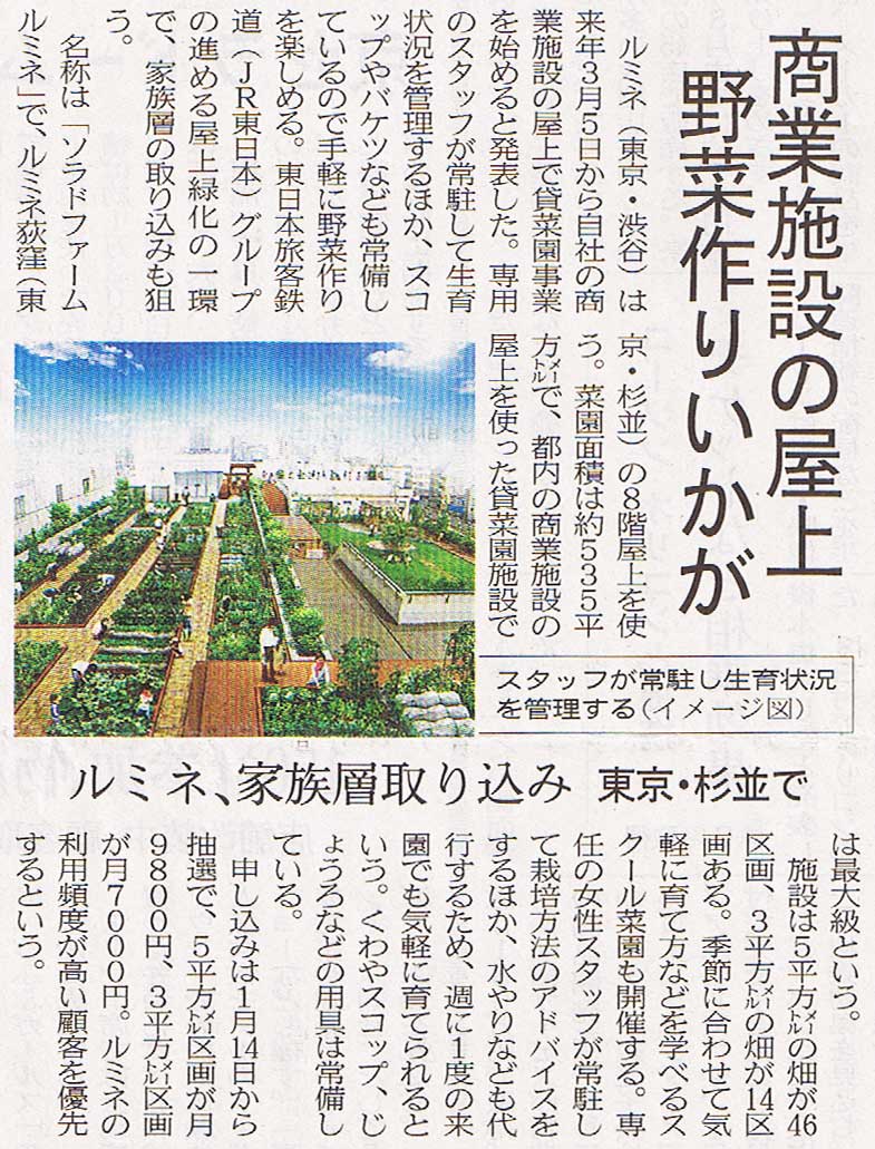 そういえば、昨年12月10日の日経流通新聞(日経MJ)に、戸田駅そばにもある人気の貸し菜園・ソラドファーム が、東京都杉並区荻窪駅に隣接する商業ビル・ルミネ荻窪の屋上にも貸し菜園として開設されることになったという記事が掲載されていました。