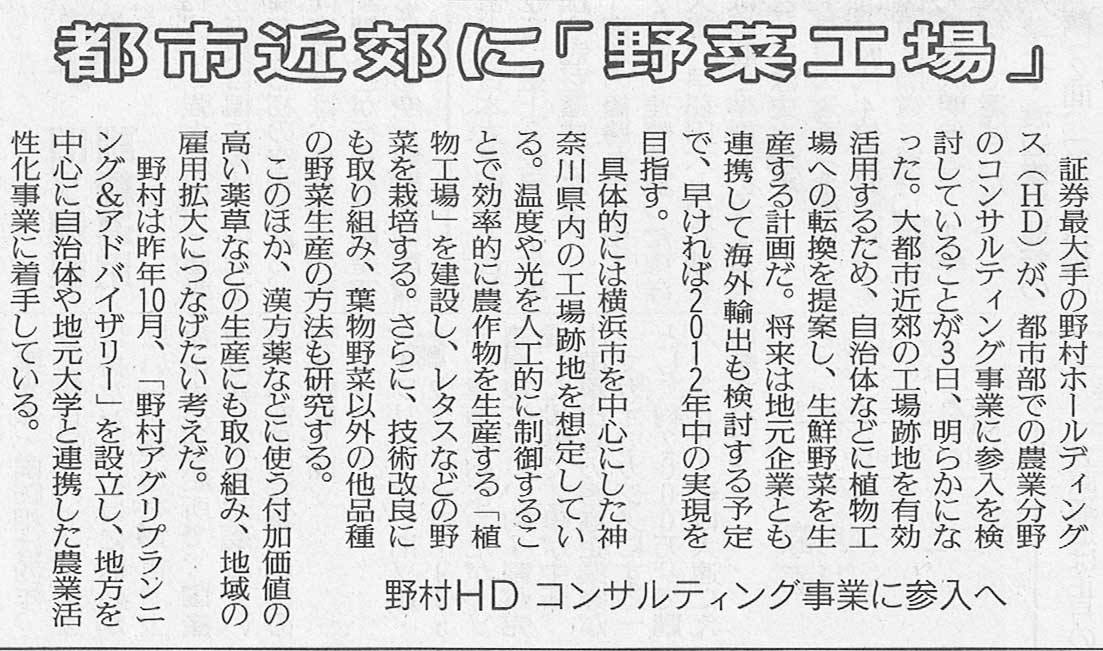 今日の読売新聞朝刊に、野村ホールディングスが、都市部での農業分野コンサルティング事業への参入を検討しているという記事が掲載されていました。