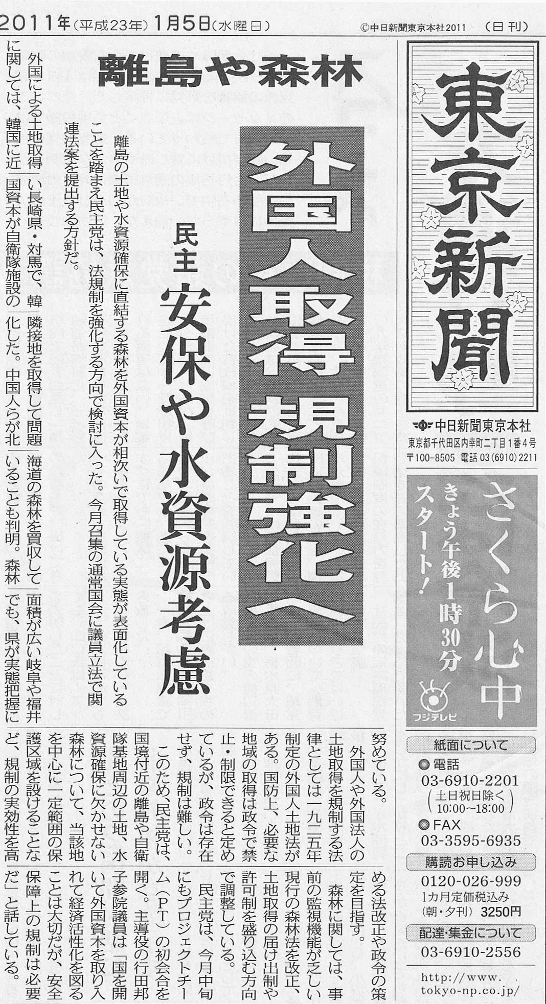 昨日の東京新聞の第一面に「離島や森林 外国人取得規制強化へ 民主 安保や水資源考慮」という見出しの記事が掲載されていました。