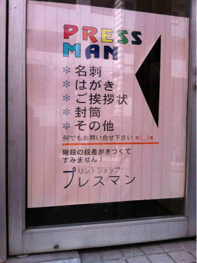 2011年01月29日 (番外編)とても正直なプリントショップ 小ネタです。 写真は麹町で見かけたプリントショップ。入口に「階段の段差がきつくてすみません!」 なんて正直な!σ(^_^;) でも、こんな感覚、好きですよ。 「番外編(戸田以外のコト)」カテゴリの最新記事 < 前の記事次の記事 > コメント コメントフォーム 名前 コメント 評価する リセット リセット 顔 星 投稿する 情報を記憶 トラックバック
