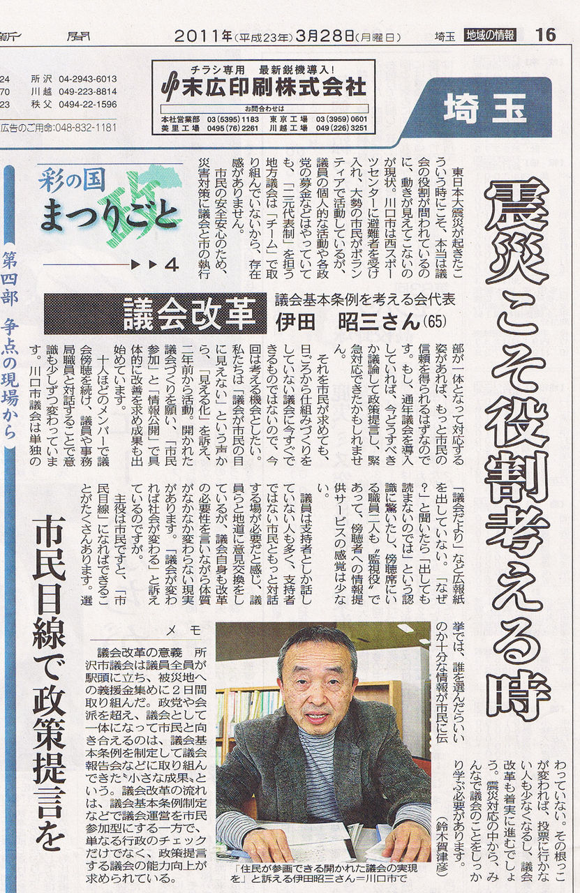 私は、埼玉県で県知事・市長、国政議員、県会議員、市議会議員との対話集会や公開討論会を不偏不党の立場から開催する市民団体「いしん埼玉市民の会(設立17周年)」の会長を努めておりますが、その会の活動委員でもあり、議会基本条例を考える会代表でもある伊田昭三さんが、本日の東京新聞埼玉版に記事掲載されておりましたので、ご紹介いたします。