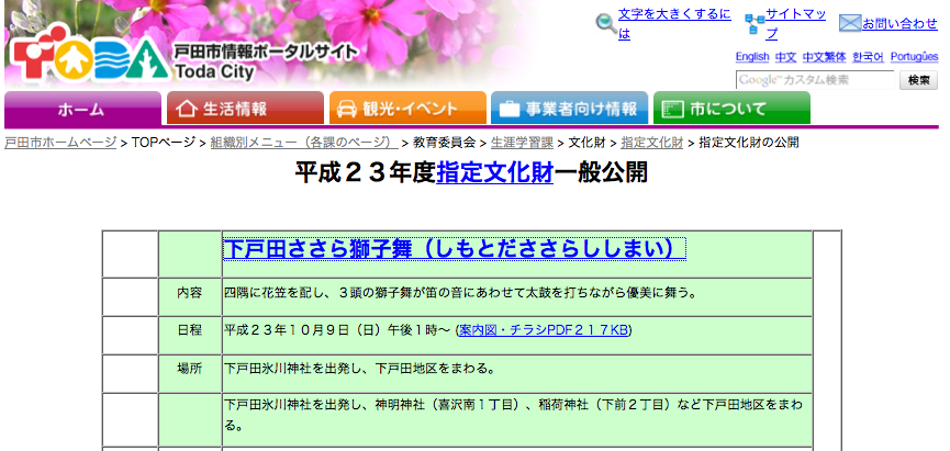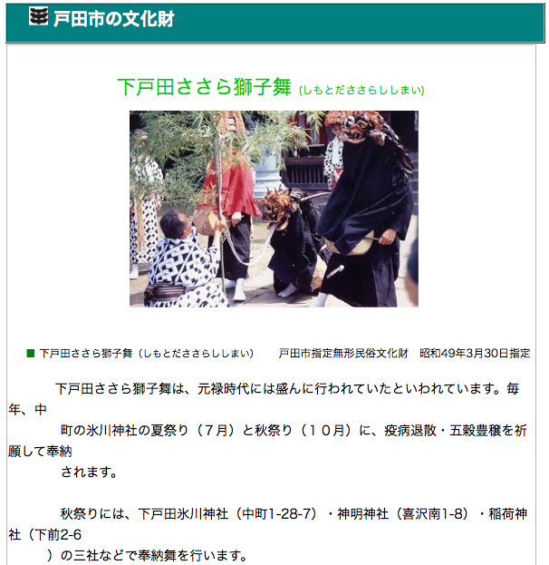 10月9日(日)に、上戸田氷川神社で「奉納演芸」が行われることはこのブログでも前に書きましたが、下戸田氷川神社では「下戸田ささら獅子舞」が奉納されるそうです。