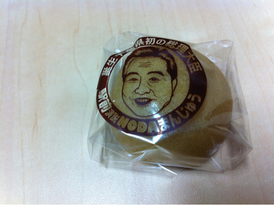 さて、この野田総理大臣まんじゅう、よく見ると「駅前演説NODA」と書かれている部分、「駅前」の次の「演説」という文字だけが小さいのです。