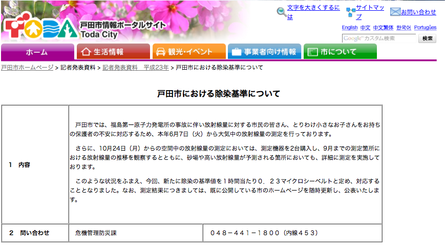 本日、戸田市は、戸田市における放射能の除染基準値を毎時0.23マイクロシーベルトに定めたことを記者発表しました。
