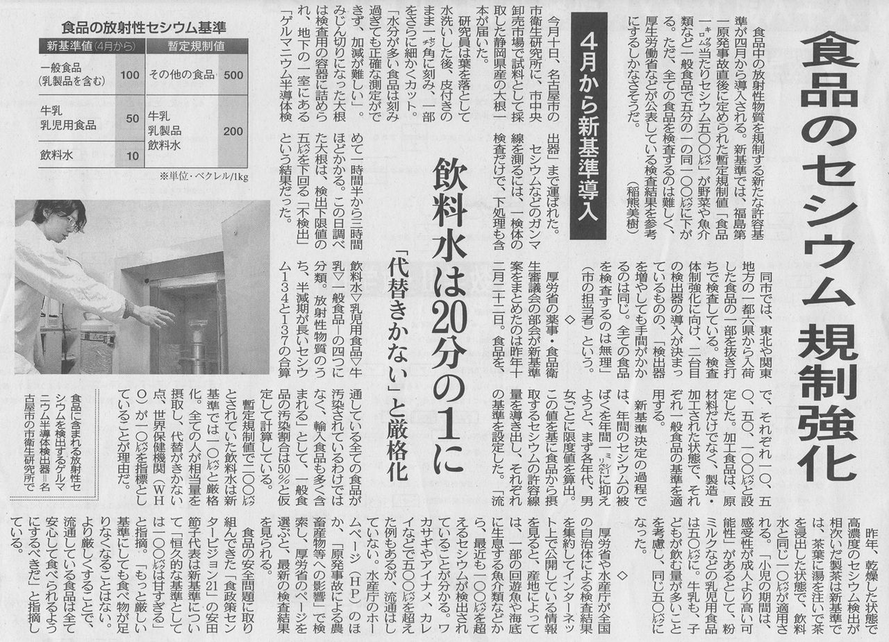 今週の月曜日の東京新聞に「食品のセシウム規制強化 4月から新基準導入」という記事が掲載されていました。
