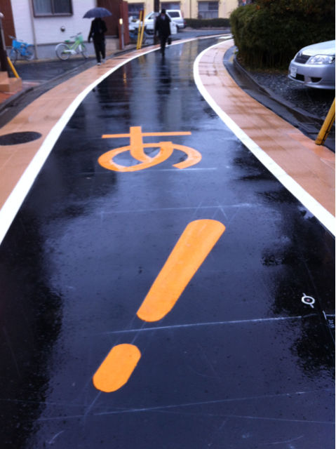 真新しい道路に「あ!」の文字が映えています。