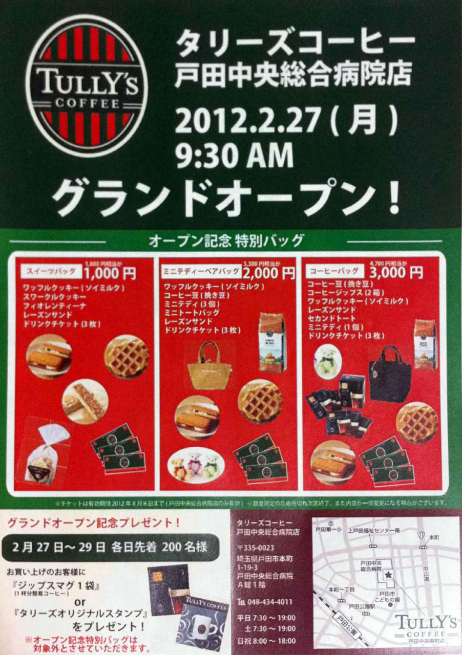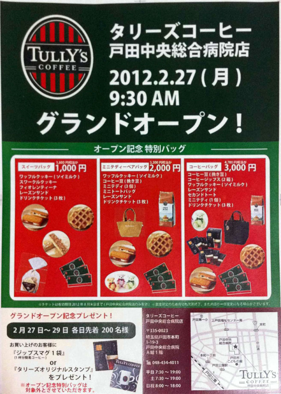 以前、このブログでも少しふれたことがありますが、あのタリーズコーヒーが、2月27日月曜日に、戸田中央総合病院内にオープンします。