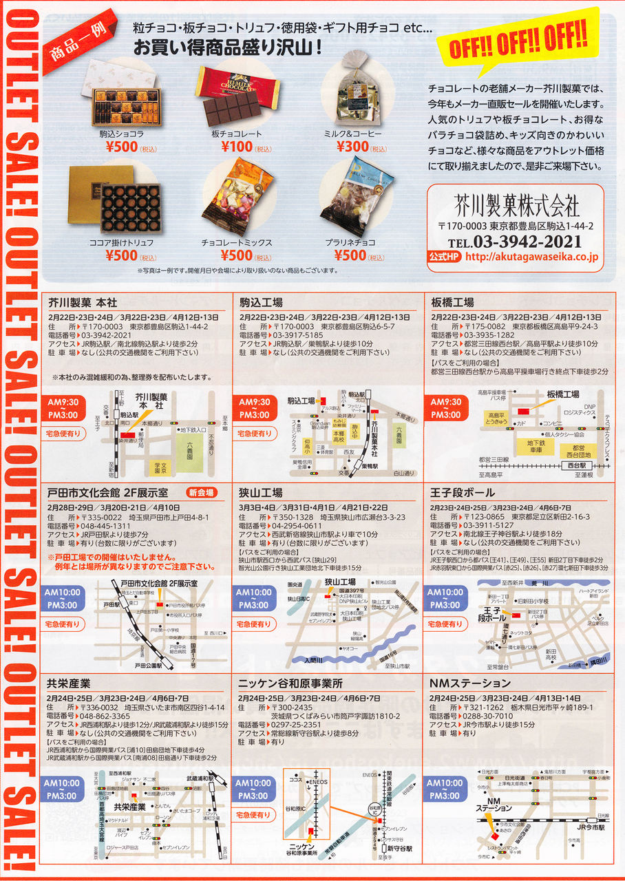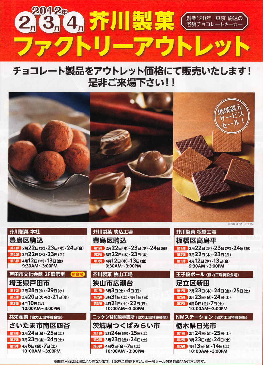 このブログのアクセスログを見ても、超人気の芥川製菓ファクトリーアウトレットが2月〜4月に開催されます。