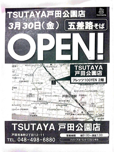 2012年03月19日 TSUTAYA戸田公園店 3月30日金曜日オープン 以前このブログでもお知らせしていましたが、戸田市五差路西側の100均ショップ・フレッツのフロアに、TSUTAYA戸田公園店が3月30日金曜日にオープンいたします。 営業時間は朝9時から深夜1時まで。 駐車場も完備されていますので、きっと賑わうことでしょうね。 「お店」カテゴリの最新記事 < 前の記事次の記事 > コメント コメントフォーム 名前 コメント 評価する リセット リセット 顔 星 投稿する 情報を記憶 トラックバック