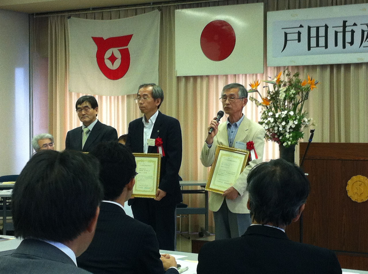 第一部では、戸田市優良推奨品(戸田ブランド事業)の認定式が行われ、市内で活動する市民活動団体エコ・とだ・ネットワークさん、突然の洪水から建物の浸水を防ぐシステムを開発された大同機工さん、彩の国・埼玉にちなんだシフォンケーキを販売されるファンシーフーズさんが、今年度新たに認定を受け、神保国男・戸田市長より認定証が手渡されました。