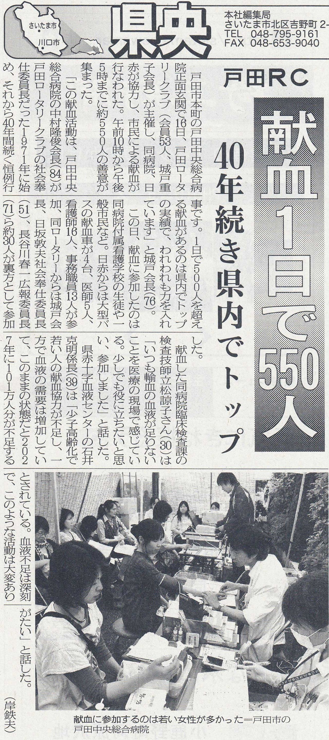今日の埼玉新聞朝刊に「戸田ロータリークラブ 献血1日で550人 40年続き県内でトップ」という記事が写真入りで掲載されていました。