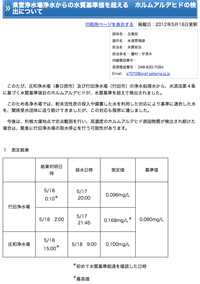 このたびの、庄和浄水場(春日部市)及び行田浄水場(行田市)の浄水から、ホルムアルデヒドが水質基準を超えて検出された件の続報です。