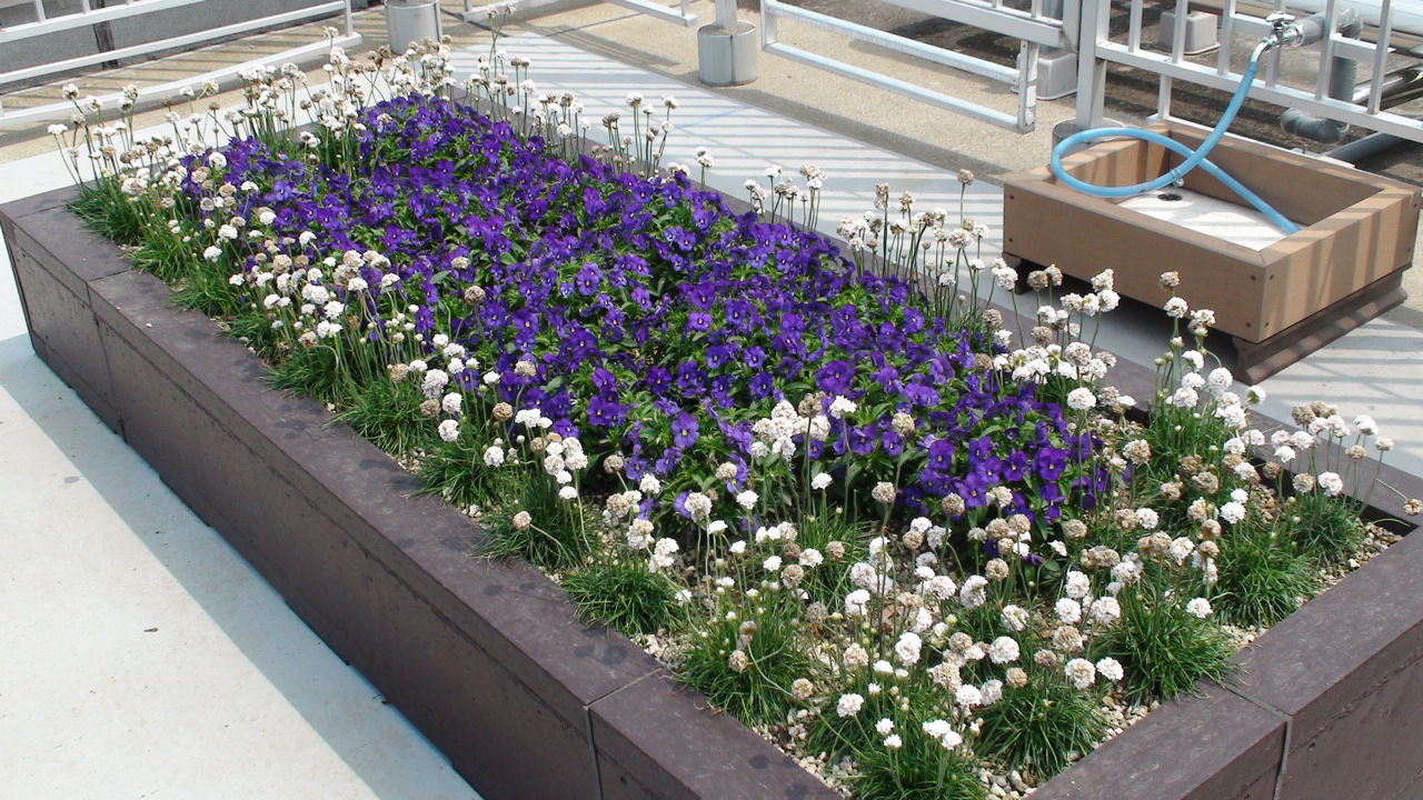 屋上緑化の基盤となっているのは、戸田市が開発した「フェルトガーデン戸田」。古着のフェルト繊維や廃品として出されたガラス粉を使った水はけの良い人工土壌です。その上に芝をはったり、このように様々な草木を植えています。
