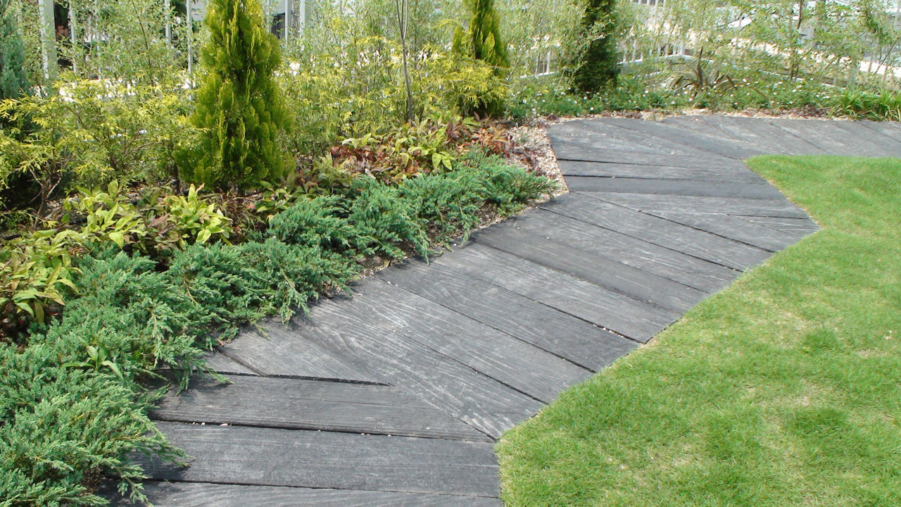 緑の小道の横にはベンチやテーブルのある憩いの空間があります。ここで「木」のように使われている偽木は、実はペットボトルキャップの廃プラスチックをもとにしたものだそうです。エコにこだわっていますね。