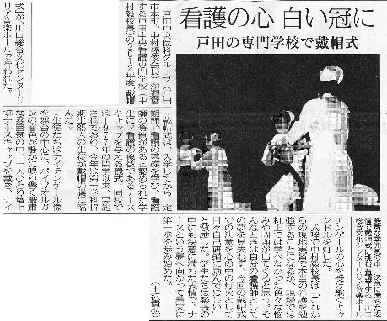 戸田中央医科グループ(戸田市本町、中村隆俊会長)が運営する戸田中央看護専門学校(中村毅校長)の2012年度「載帽式」が、川口総合文化センターリリア音楽ホールで行われた。
