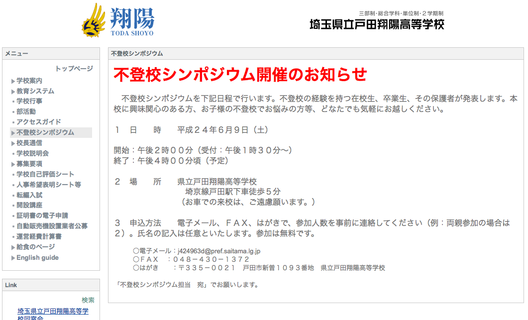 シンポジウムは午後2時から同4時ごろまで、会場は同校体育館。参加無料。申込みはファクス(048-430-1372)、電子メール(j424963d@pref.saitama.lg.jp)、はがき 〒335-0021 戸田市新曽1093 県立戸田翔陽高校。